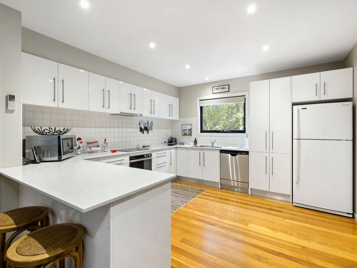 The lower-level open plan living consists of a gleaming white kitchen finished with stainless-steel appliances and stone bench tops and breakfast bar which adjoins the dining area and main living room. Large format sliders open to the north-facing deck that framed with a canopy of ornamental grape vines and the backdrop the Manchurian pears and silver birches.