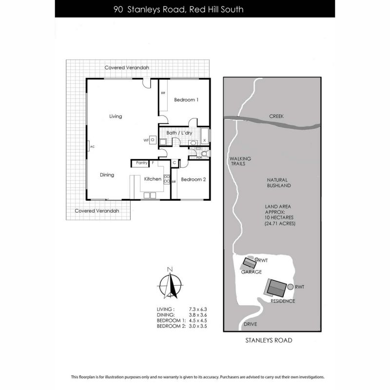 The mostly level – lightly undulating 10 hectares (24.71 Acres) property has a short drive off Stanleys Road that opens to a clearing of around half an acre where the well-maintained two bedroom brick homestead, surrounding lawned area, garage and workshop shedding, and 45,000 lt. water tank are positioned.