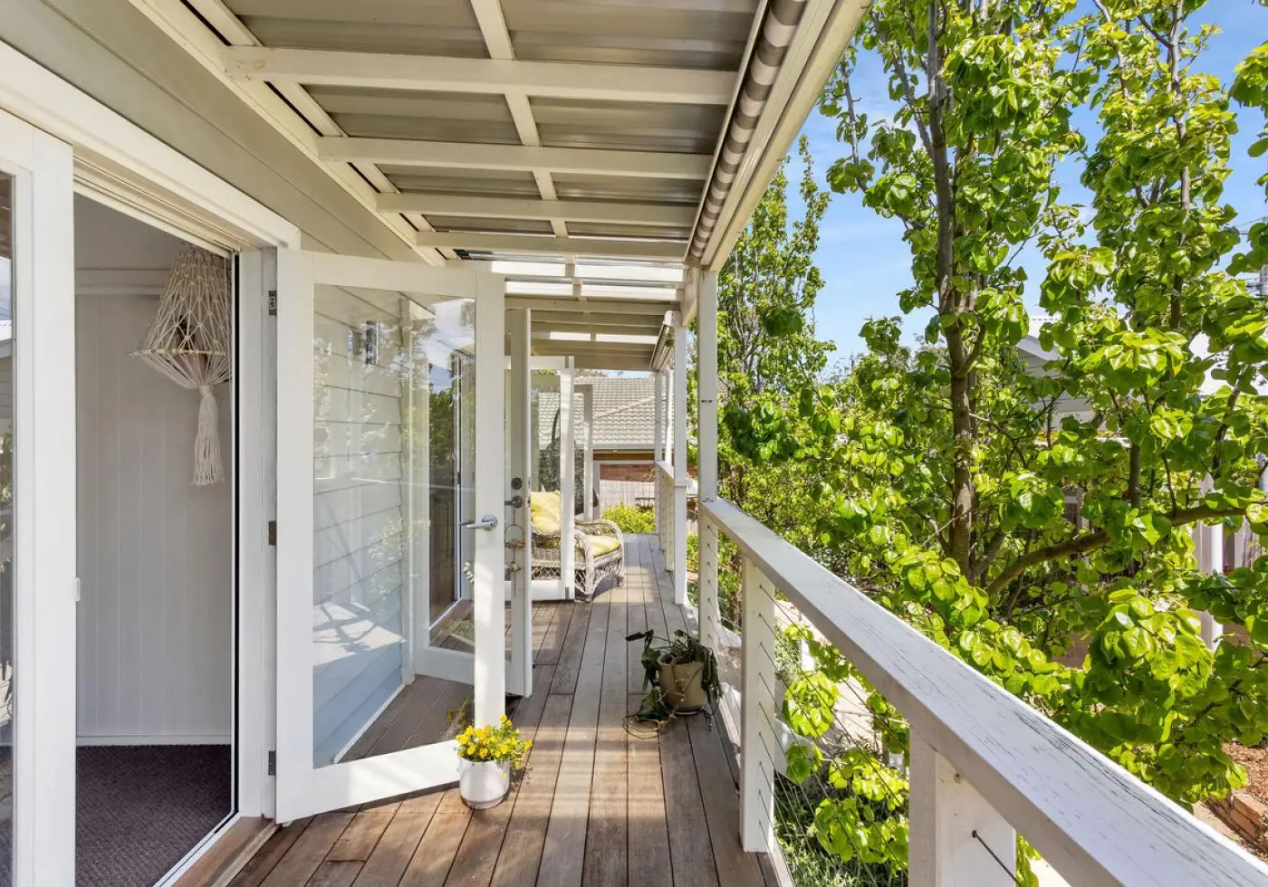 The main bedroom offers a peaceful retreat with its own French doors to the veranda, built-in robes, and ensuite access to the central bathroom. A second bedroom with built-in robes and a desk provides flexibility for guests, a study, or creative space.